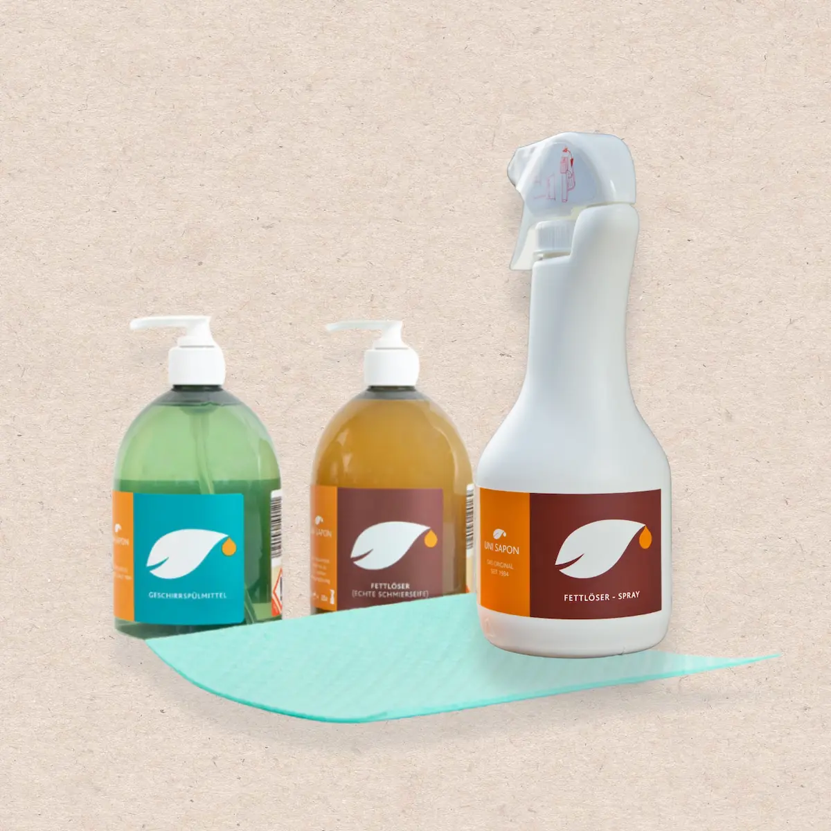 Mit dieser ökologischen Reinigungskombination hat selbst hartnäckiger Fettschmutz keine Chance.